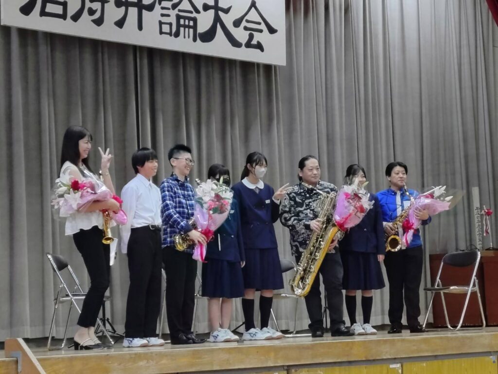 ■今年度は弁士7名で開催されました。最優秀賞は千葉市立川戸中学校三年生でした。尚、審査時間の合間に「音楽のプレゼント」として、サクソフォンカルテットによる演奏を提供し、好評を博しました。当クラブより、優勝カップ、入賞盾、参加賞、記念品を贈呈しました。
